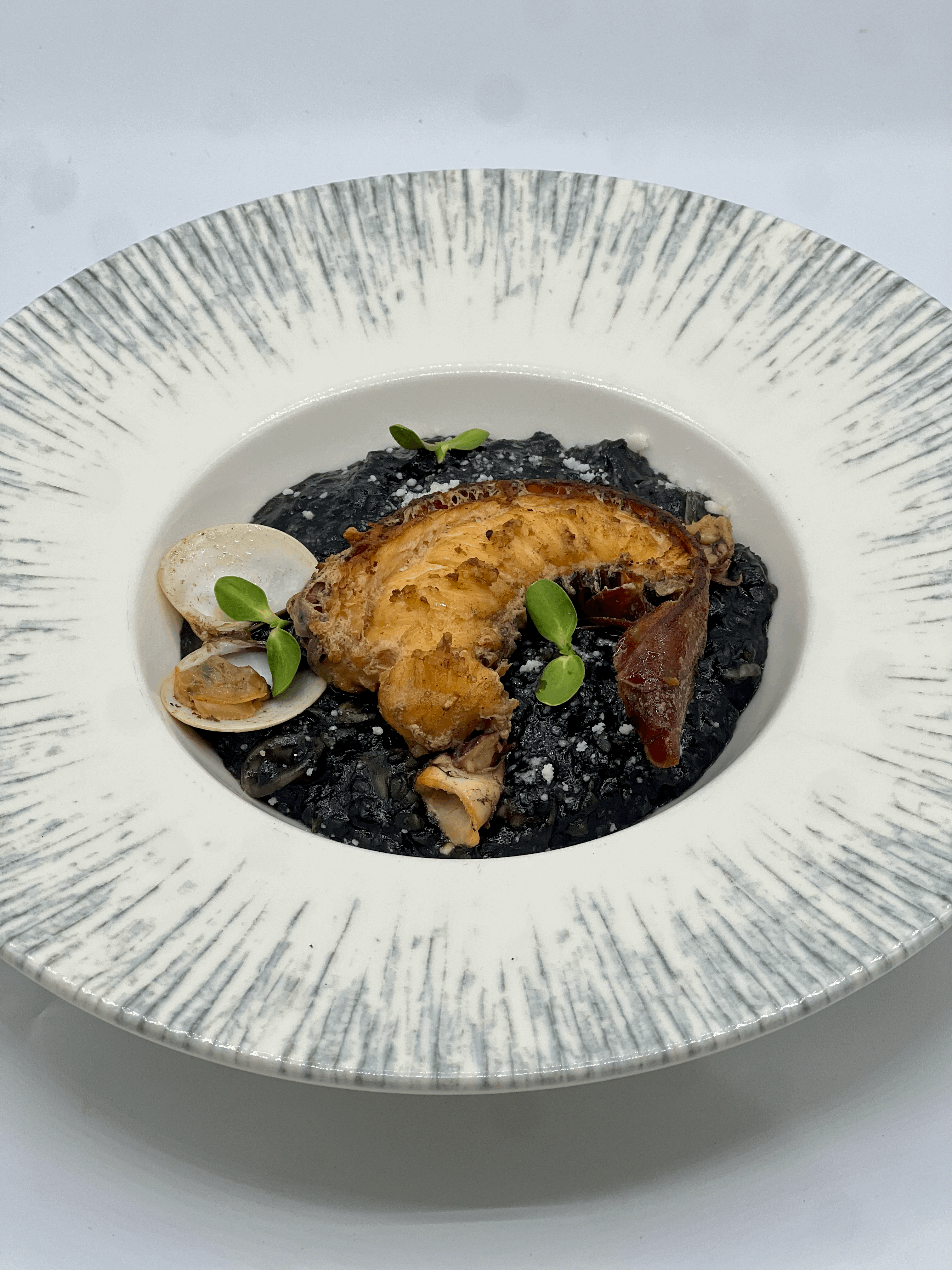 Risotto en tinta de calamar y mariscos mixtos, langostita 3oz