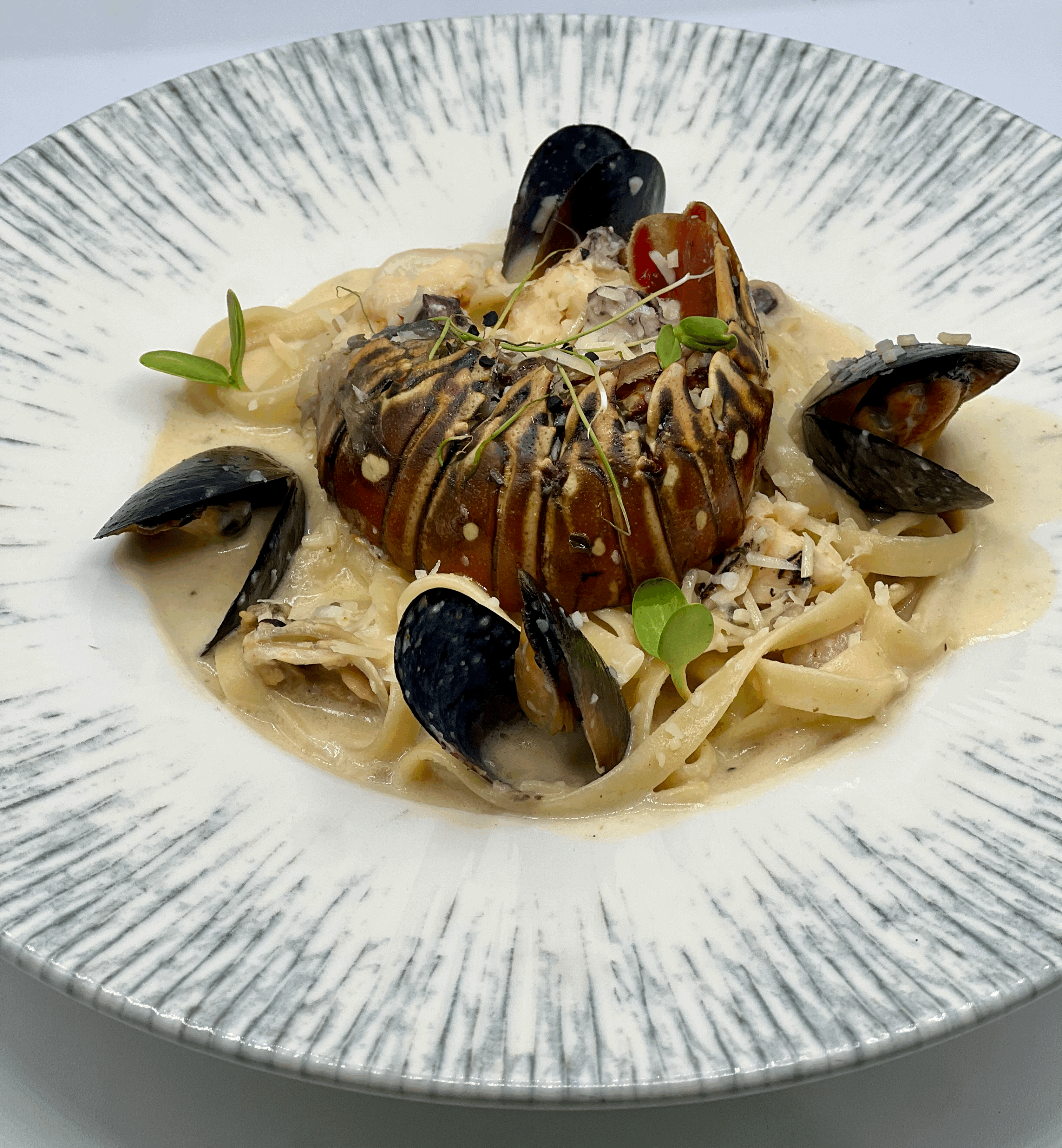 Fettuccini salteados en salsa blanca con mariscos y mejillones coronada con una langosta 3oz
