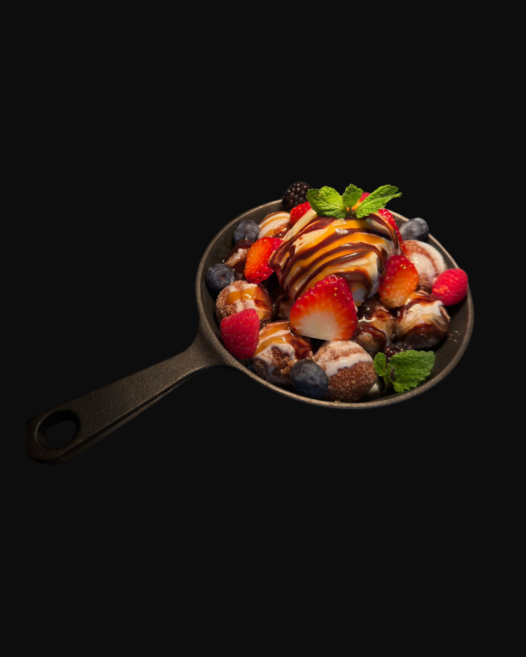 Salted caramel ice cream, cream cheese with sugar and Madagascar vanilla, white chocolate, and fresh fruits